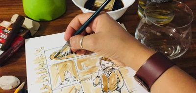 . . . Di grappa e solo di grappa . . . Prescelta la foto che ritrae la giovane pittrice toscana Dominga Tammone mentre, pennello e “cafferello” alla mano, colora la vignetta della vetrina della storica tabaccheria/caffetteria Soldati di Grosseto. Ispiratrice la grappa Nannoni di cui Priscilla Occhipinti è l’anima e l’appassionata facitrice La XV